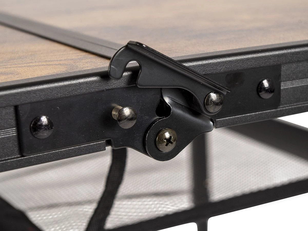 De Bo-Camp Industrial Greene 120 x 60 is een stijlvolle campingtafel met een houtlook tafelblad en een industriële uitstraling.