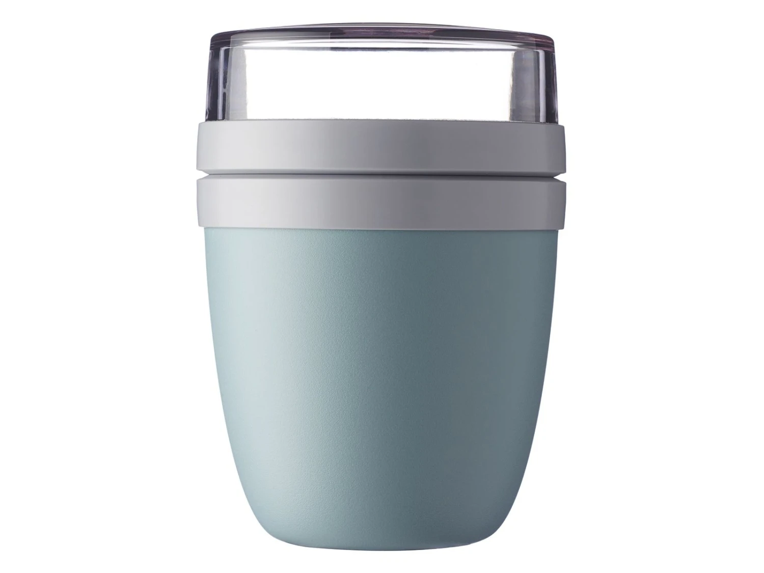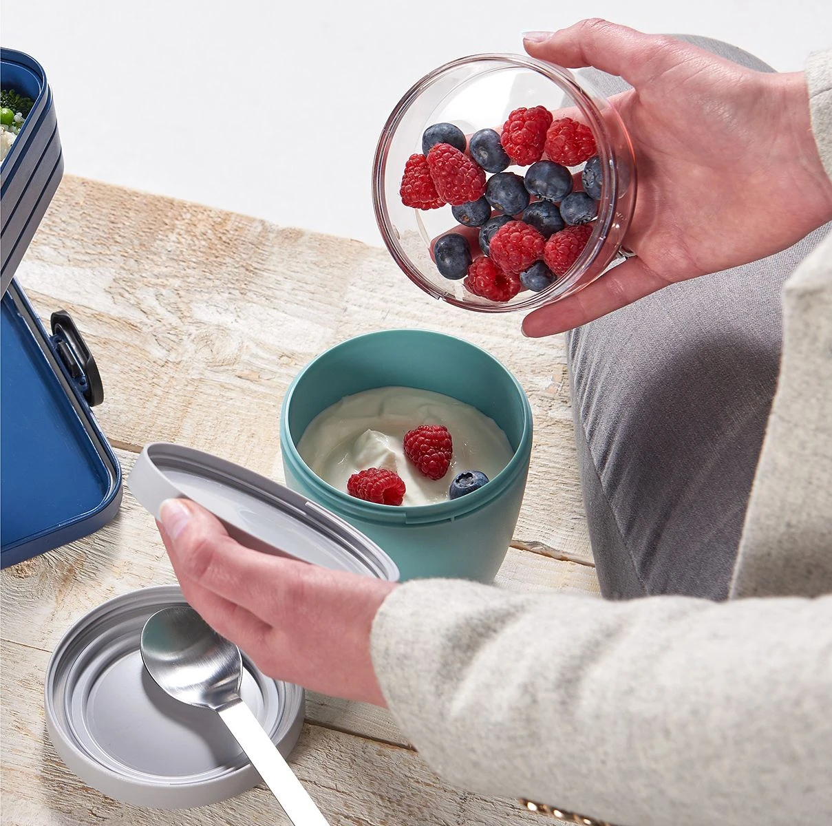 De Mepal lunch pot Ellipse is één handig product om je lunch of tussendoortje mee te nemen, maar heeft twee verschillende compartimenten om de verschillende ingrediënten gescheiden te houden. Bijvoorbeeld de yoghurt en de muesli of fruit zitten in een aparte container, waarbij de deksel van de yoghurtbeker niet de bodem van de mueslicontainer is. Door middel van een eenvoudige draaibeweging scheid je de twee compartimenten om de ingrediënten te mixen. Dé oplossing om geknoei tijdens het mengen te voorkomen. De beide containers hebben een aparte deksel en blijven daarom ook schoon. Bovendien passen de deksels op beide containers, dus je hoeft ’s ochtends niet op zoek naar de juiste deksel.