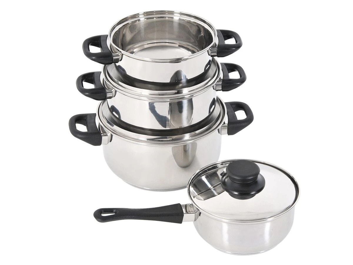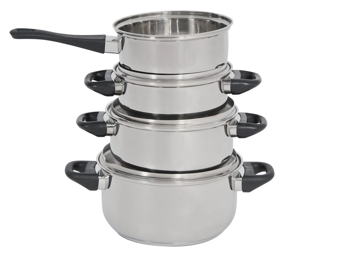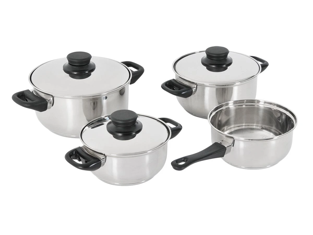 De set bestaat uit 3 kookpannen met deksels en 1 steelpan waarop je dezelfde deksel kunt gebruiken als die van de kleine pan. De pannen zijn geschikt voor alle warmtebronnen.
