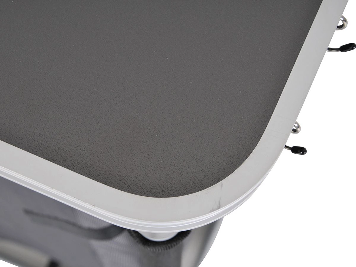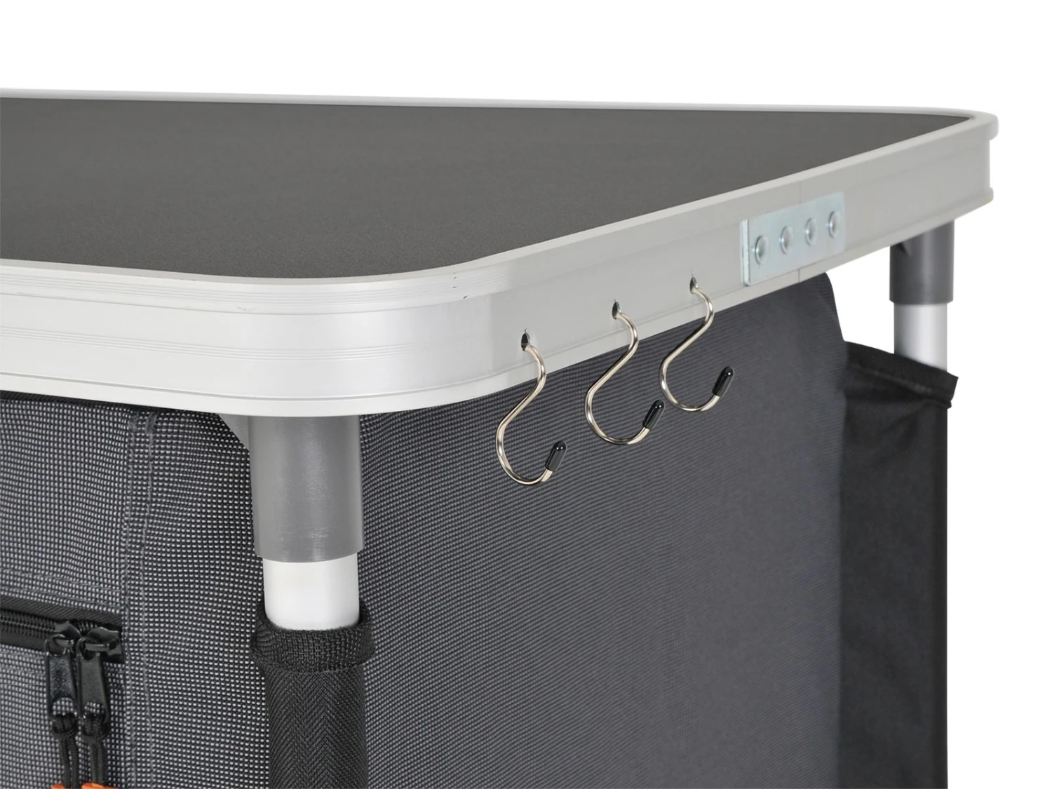 De kast is voorzien van vier verstelbare poten zodat je de kast altijd waterpas kunt zetten op een ongelijke ondergrond. Het blad is gemaakt van MDF en afgewerkt met een aluminium rand, hierdoor is de kast NIET water- en hittebestendig.