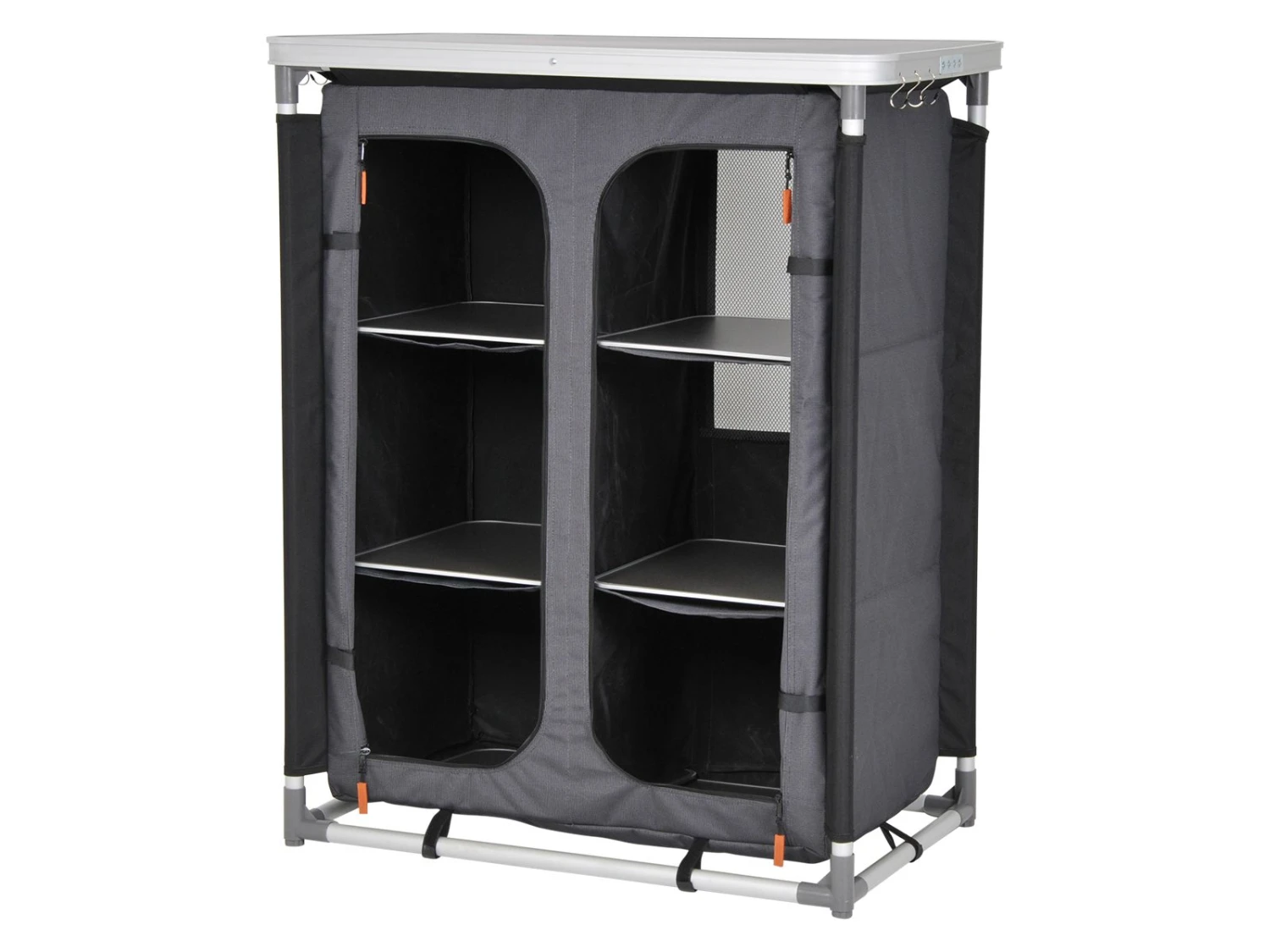 Wil je graag tijdens het kamperen al je spullen netjes en overzichtelijk op kunnen bergen? Kies dan voor de Obelink Brussel Luxe, deze hoge campingkast heeft 6 ruime opbergvakken waar je al je campingspullen in kunt opbergen. De achterzijde is voorzien van mesh gaas dat ervoor zorgt dat de kast goed geventileerd wordt. Eén zijkant heeft drie ophanghaakjes, ideaal om bijvoorbeeld je handdoek of fleece vest aan op te hangen.