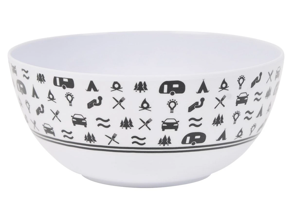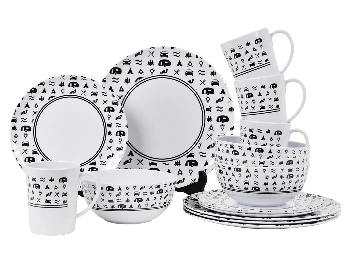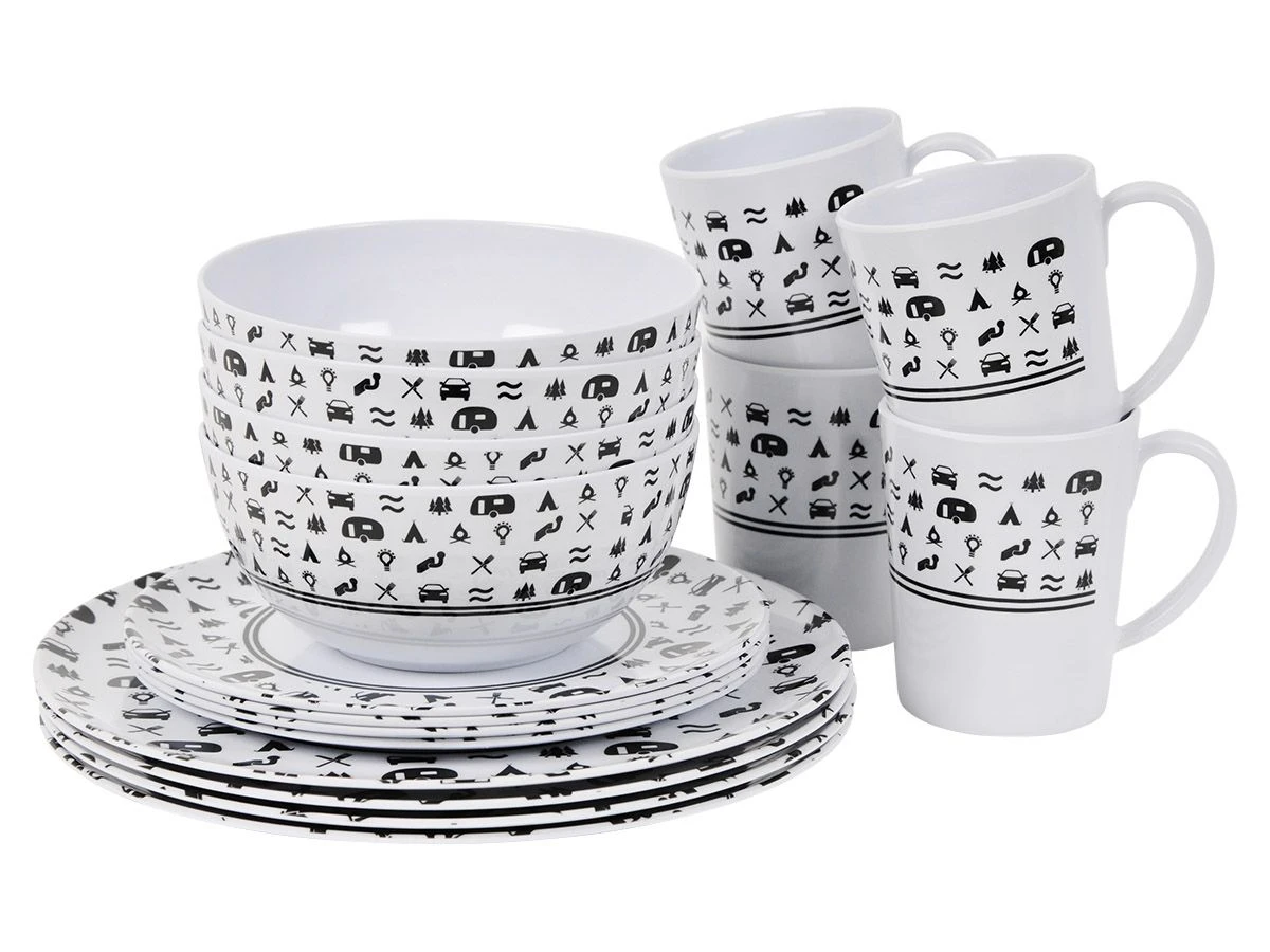 Ben jij een echte kampeer fan? Dan mag dit mooie camping servies van Obelink niet ontbreken in jouw campinguitrusting! Dankzij de witte kleur en de zwarte opdruk is deze set goed te combineren met ander servies en bestek.
