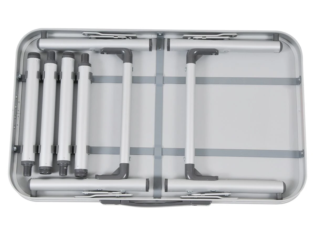De bijzettafel is voorzien van een lichtgewicht aluminium onderstel, een MDF gecoat tafelblad met een aluminium rand. De tafel is niet water- en hitte bestendig. Het tafelblad is voorzien van een handig handvat zodat je de tafel makkelijk mee kunt nemen.