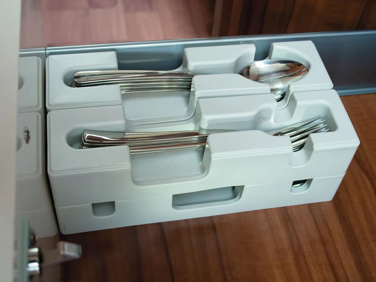 Het bestek blijft ook nog vast liggen omdat de vakken een voorvorming hebben in het vak. Ideaal tegen rondvliegend bestek! Deze set is vormvast en is ruimtebesparend!