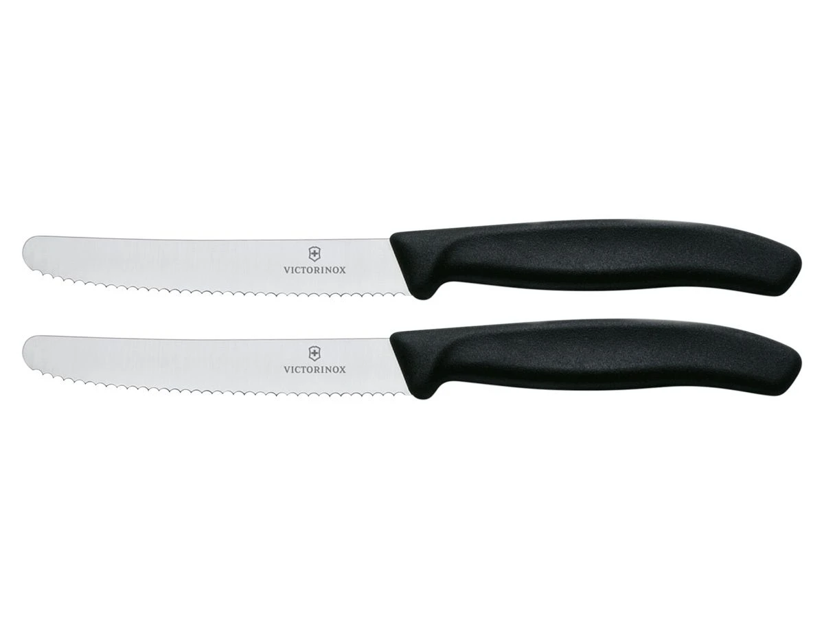 Een goed vlijmscherp gekarteld mesje hoort eigenlijk iedereen in de keuken te hebben. Super praktisch voor het snijden van bijvoorbeeld tomaten, blokjes kaas of harde worst. Deze tafelmessen hebben een 11 cm lang lemmet van RVS en een heft van polypropyleen.